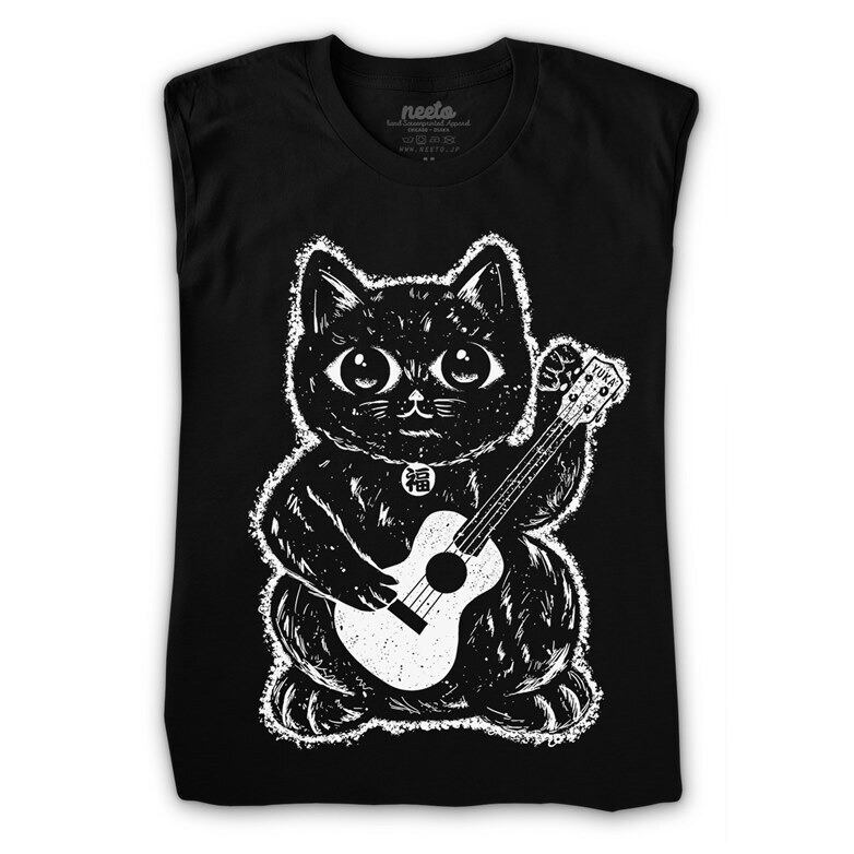 This Lucky Cat T-shirt features a unique and fun design of a beckoning cat playing the ukulele. The fusion of the beckoning cat, a traditional Japanese symbol of good luck, and the ukulele, which plays a pleasant tone, makes this T-shirt stylish and fun to look at.
